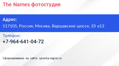 The Names, фотостудия по адресу 117105, Россия, Москва, Варшавское шоссе, 33 к13 в дальнейшем Организация, размещена в следующих категориях: