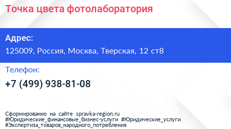 Точка цвета, фотолаборатория по адресу 125009, Россия, Москва, Тверская, 12 ст8 в дальнейшем Организация, размещена в следующих категориях: