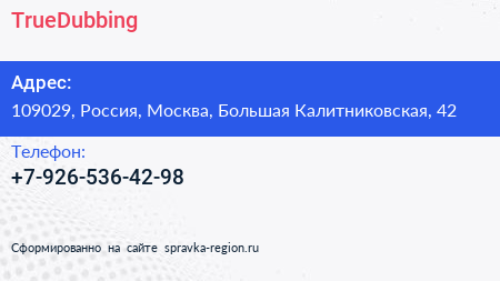 TrueDubbing по адресу 109029, Россия, Москва, Большая Калитниковская, 42 в дальнейшем Организация, размещена в следующих категориях: