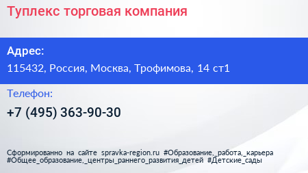 Туплекс, торговая компания по адресу 115432, Россия, Москва, Трофимова, 14 ст1 в дальнейшем Организация, размещена в следующих категориях: