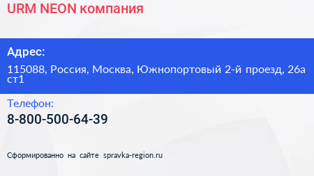 URM-NEON, компания по адресу 115088, Россия, Москва, Южнопортовый 2-й проезд, 26а ст1 в дальнейшем Организация, размещена в следующих категориях: