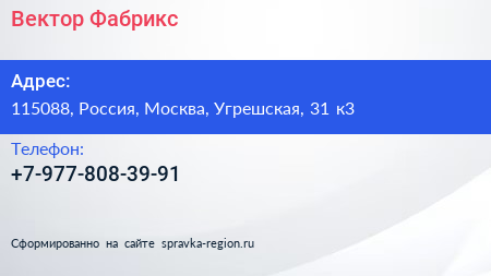 Вектор Фабрикс по адресу 115088, Россия, Москва, Угрешская, 31 к3 в дальнейшем Организация, размещена в следующих категориях: