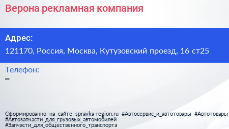 Верона, рекламная компания по адресу 121170, Россия, Москва, Кутузовский проезд, 16 ст25 в дальнейшем Организация, размещена в следующих категориях:
