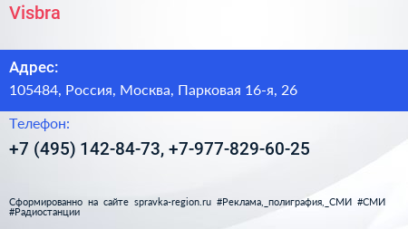 Visbra по адресу 105484, Россия, Москва, Парковая 16-я, 26 в дальнейшем Организация, размещена в следующих категориях: