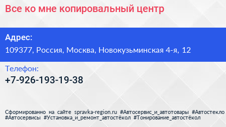 Все ко мне, копировальный центр по адресу 109377, Россия, Москва, Новокузьминская 4-я, 12 в дальнейшем Организация, размещена в следующих категориях: