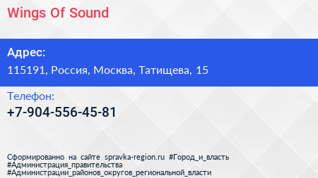 Wings Of Sound по адресу 115191, Россия, Москва, Татищева, 15 в дальнейшем Организация, размещена в следующих категориях: