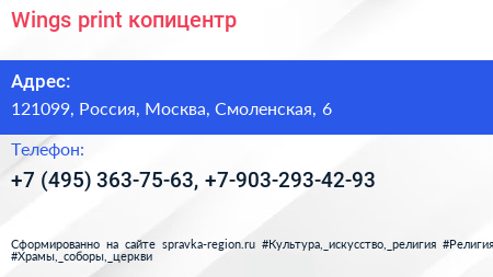 Wings print, копицентр по адресу 121099, Россия, Москва, Смоленская, 6 в дальнейшем Организация, размещена в следующих категориях: