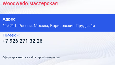 Woodwedo, мастерская по адресу 115211, Россия, Москва, Борисовские Пруды, 1а в дальнейшем Организация, размещена в следующих категориях: