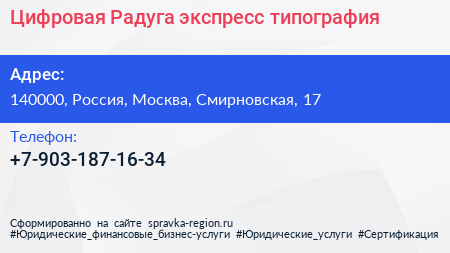 Цифровая Радуга, экспресс-типография по адресу 140000, Россия, Москва, Смирновская, 17 в дальнейшем Организация, размещена в следующих категориях: