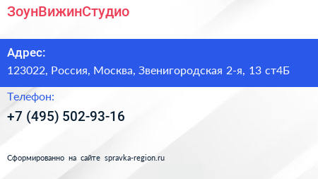 ЗоунВижинСтудио по адресу 123022, Россия, Москва, Звенигородская 2-я, 13 ст4Б в дальнейшем Организация, размещена в следующих категориях:
