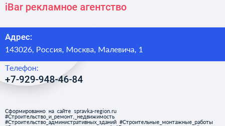 iBar, рекламное агентство по адресу 143026, Россия, Москва, Малевича, 1 в дальнейшем Организация, размещена в следующих категориях:
