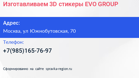 Изготавливаем 3D стикеры EVO GROUP по адресу Москва, ул Южнобутовская, 70 в дальнейшем Организация, размещена в следующих категориях: