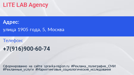 LITE LAB Agency по адресу улица 1905 года, 5, Москва в дальнейшем Организация, размещена в следующих категориях: