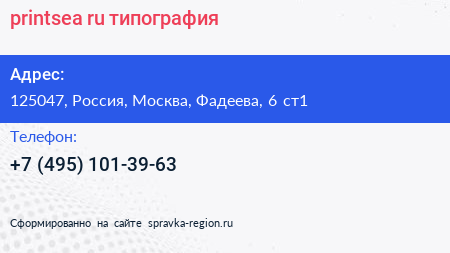 printsea.ru, типография по адресу 125047, Россия, Москва, Фадеева, 6 ст1 в дальнейшем Организация, размещена в следующих категориях: