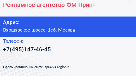 Рекламное агентство "ФМ Принт" по адресу Варшавское шоссе, 1с6, Москва в дальнейшем Организация, размещена в следующих категориях: