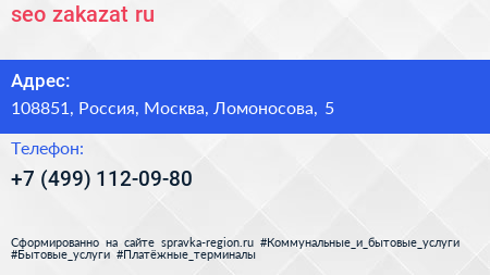 seo-zakazat.ru по адресу 108851, Россия, Москва, Ломоносова, 5 в дальнейшем Организация, размещена в следующих категориях: