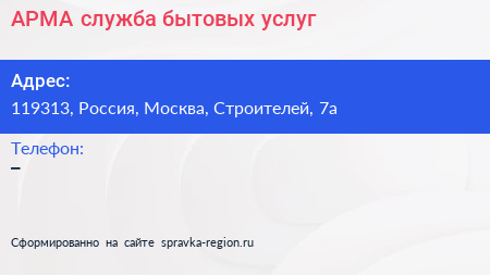 АРМА, служба бытовых услуг по адресу 119313, Россия, Москва, Строителей, 7а в дальнейшем Организация, размещена в следующих категориях: