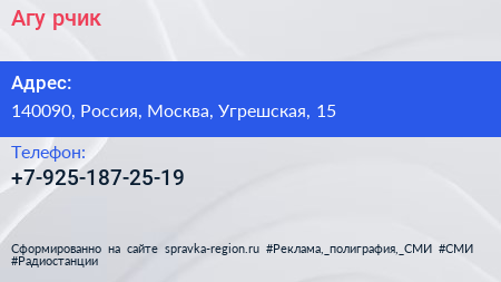 Агу.рчик по адресу 140090, Россия, Москва, Угрешская, 15 в дальнейшем Организация, размещена в следующих категориях: