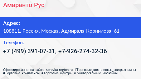 Амаранто Рус по адресу 108811, Россия, Москва, Адмирала Корнилова, 61 в дальнейшем Организация, размещена в следующих категориях: