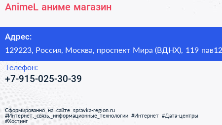 AnimeL, аниме-магазин по адресу 129223, Россия, Москва, проспект Мира (ВДНХ), 119 пав12 в дальнейшем Организация, размещена в следующих категориях:
