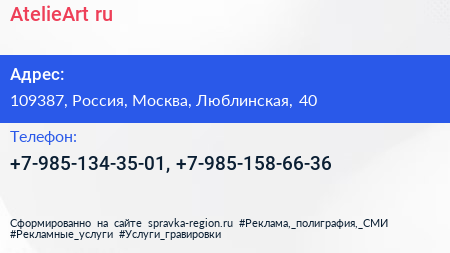 AtelieArt.ru по адресу 109387, Россия, Москва, Люблинская, 40 в дальнейшем Организация, размещена в следующих категориях: