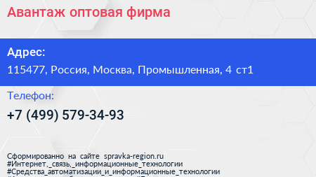 Авантаж, оптовая фирма по адресу 115477, Россия, Москва, Промышленная, 4 ст1 в дальнейшем Организация, размещена в следующих категориях: