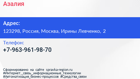 Азалия по адресу 123298, Россия, Москва, Ирины Левченко, 2 в дальнейшем Организация, размещена в следующих категориях: