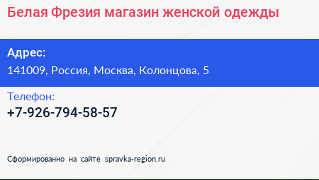Белая Фрезия, магазин женской одежды по адресу 141009, Россия, Москва, Колонцова, 5 в дальнейшем Организация, размещена в следующих категориях: