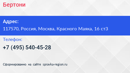 Бертони по адресу 117570, Россия, Москва, Красного Маяка, 16 ст3 в дальнейшем Организация, размещена в следующих категориях: