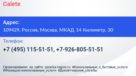 Calete по адресу 109429, Россия, Москва, МКАД 14 Километр, 30 в дальнейшем Организация, размещена в следующих категориях: