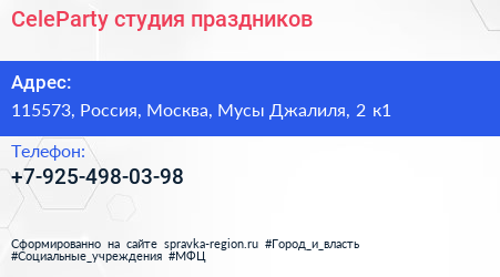 CeleParty, студия праздников по адресу 115573, Россия, Москва, Мусы Джалиля, 2 к1 в дальнейшем Организация, размещена в следующих категориях:
