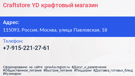 Craftstore YD, крафтовый магазин по адресу 115093, Россия, Москва, улица Павловская, 18 в дальнейшем Организация, размещена в следующих категориях: