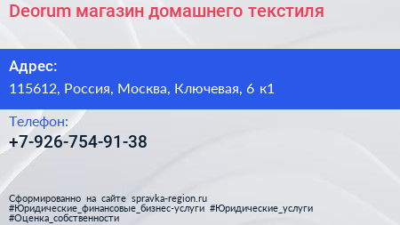 Deorum, магазин домашнего текстиля по адресу 115612, Россия, Москва, Ключевая, 6 к1 в дальнейшем Организация, размещена в следующих категориях:
