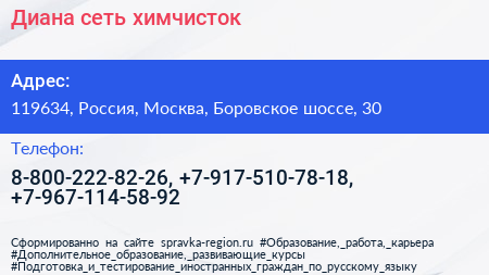 Диана, сеть химчисток по адресу 119634, Россия, Москва, Боровское шоссе, 30 в дальнейшем Организация, размещена в следующих категориях:
