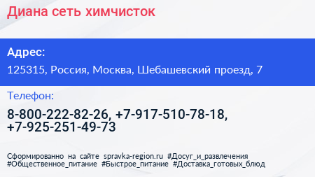 Диана, сеть химчисток по адресу 125315, Россия, Москва, Шебашевский проезд, 7 в дальнейшем Организация, размещена в следующих категориях: