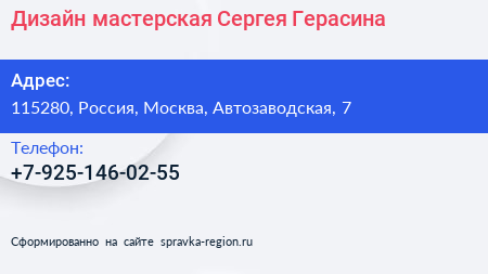 Дизайн-мастерская Сергея Герасина по адресу 115280, Россия, Москва, Автозаводская, 7 в дальнейшем Организация, размещена в следующих категориях: