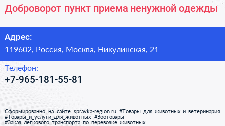 Доброворот, пункт приема ненужной одежды по адресу 119602, Россия, Москва, Никулинская, 21 в дальнейшем Организация, размещена в следующих категориях: