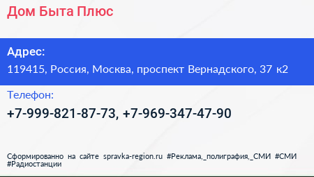 Дом Быта Плюс по адресу 119415, Россия, Москва, проспект Вернадского, 37 к2 в дальнейшем Организация, размещена в следующих категориях:
