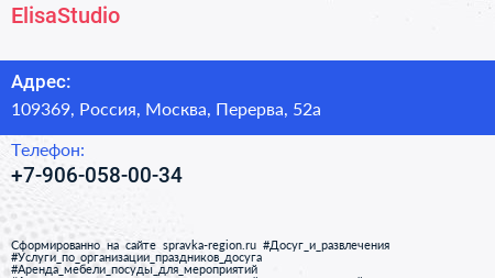 ElisaStudio по адресу 109369, Россия, Москва, Перерва, 52а в дальнейшем Организация, размещена в следующих категориях: