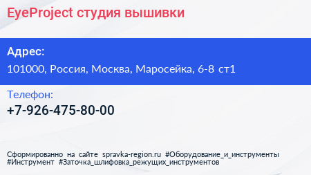 EyeProject, студия вышивки по адресу 101000, Россия, Москва, Маросейка, 6-8 ст1 в дальнейшем Организация, размещена в следующих категориях:
