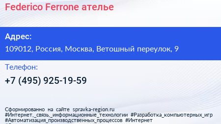Federico Ferrone, ателье по адресу 109012, Россия, Москва, Ветошный переулок, 9 в дальнейшем Организация, размещена в следующих категориях:
