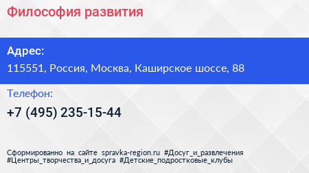 Философия развития по адресу 115551, Россия, Москва, Каширское шоссе, 88 в дальнейшем Организация, размещена в следующих категориях: