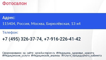 Фотосалон по адресу 115404, Россия, Москва, Бирюлёвская, 13 к4 в дальнейшем Организация, размещена в следующих категориях: