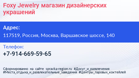 Foxy Jewelry, магазин дизайнерских украшений по адресу 117519, Россия, Москва, Варшавское шоссе, 140 в дальнейшем Организация, размещена в следующих категориях:
