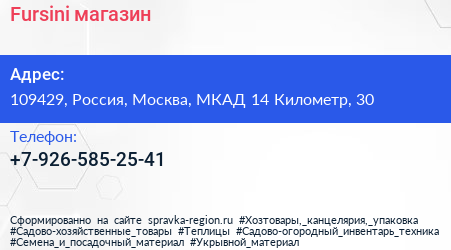 Fursini, магазин по адресу 109429, Россия, Москва, МКАД 14 Километр, 30 в дальнейшем Организация, размещена в следующих категориях: