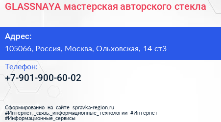GLASSNAYA, мастерская авторского стекла по адресу 105066, Россия, Москва, Ольховская, 14 ст3 в дальнейшем Организация, размещена в следующих категориях: