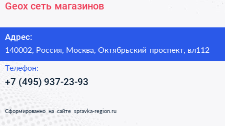 Geox, сеть магазинов по адресу 140002, Россия, Москва, Октябрьский проспект, вл112 в дальнейшем Организация, размещена в следующих категориях: