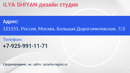ILYA SHIYAN, дизайн-студия по адресу 121151, Россия, Москва, Большая Дорогомиловская, 7/2 в дальнейшем Организация, размещена в следующих категориях: