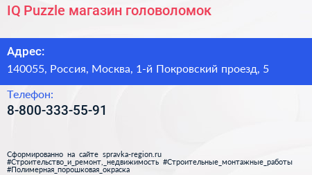 IQ Puzzle, магазин головоломок по адресу 140055, Россия, Москва, 1-й Покровский проезд, 5 в дальнейшем Организация, размещена в следующих категориях: