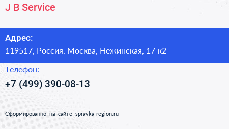 J & B Service по адресу 119517, Россия, Москва, Нежинская, 17 к2 в дальнейшем Организация, размещена в следующих категориях: